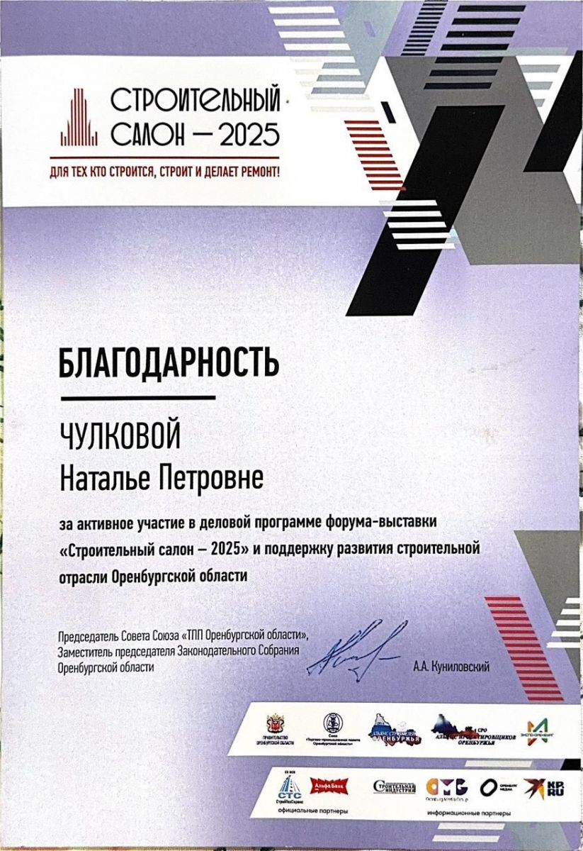 Одним из спикеров в вопросах непрерывного образования специалистов строительной отрасли выступала директор ООО «Центр проектирования», председатель Государственной аттестационной комиссии ГАПОУ «Бузулукский строительный колледж» Чулкова Наталья Петровна и по итогу мероприятия награждена благодарностью за активное участие в деловой программе форума-выставки «Строительный салон-2025» и поддержку развития строительной отрасли Оренбургской области.